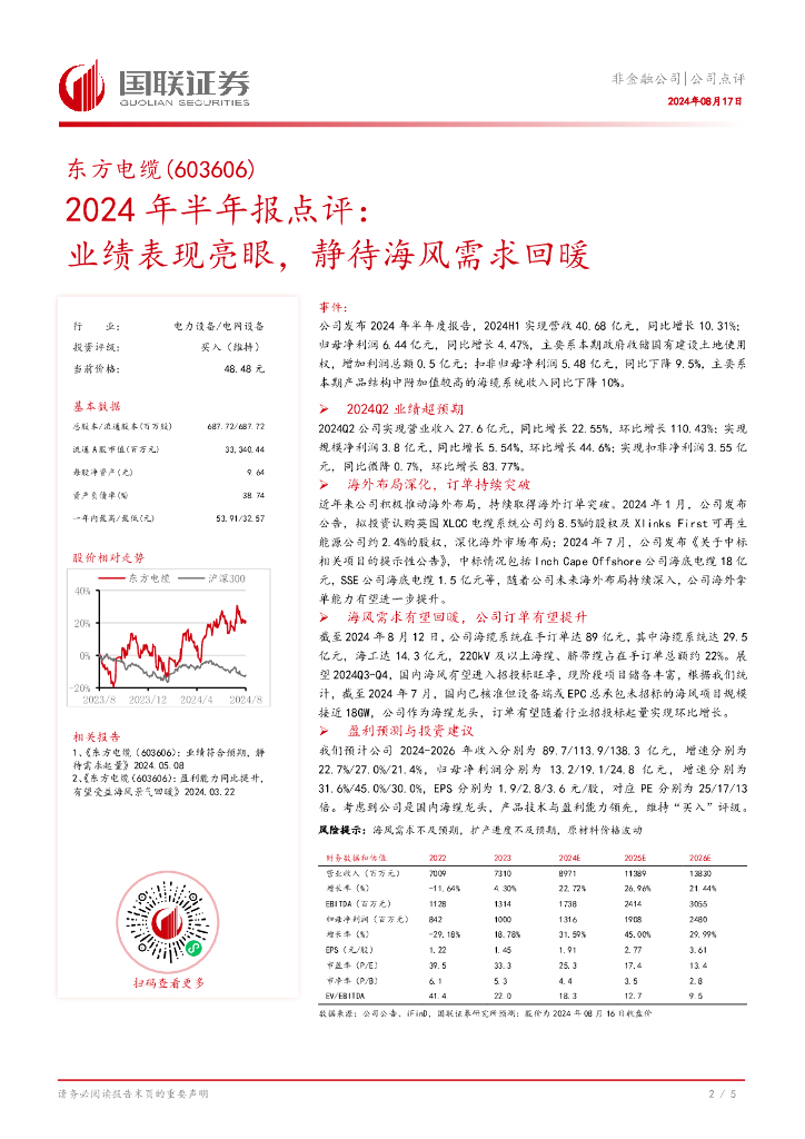 国联证券:东方电缆(603606)-2024年半年报点评:业绩表现亮眼,静待海风需求回暖.pdf