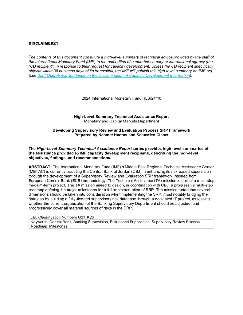 国际货币基金组织:2024年约旦技术援助报告-制定监督审查和评估程序SRP框架(英文版).pdf