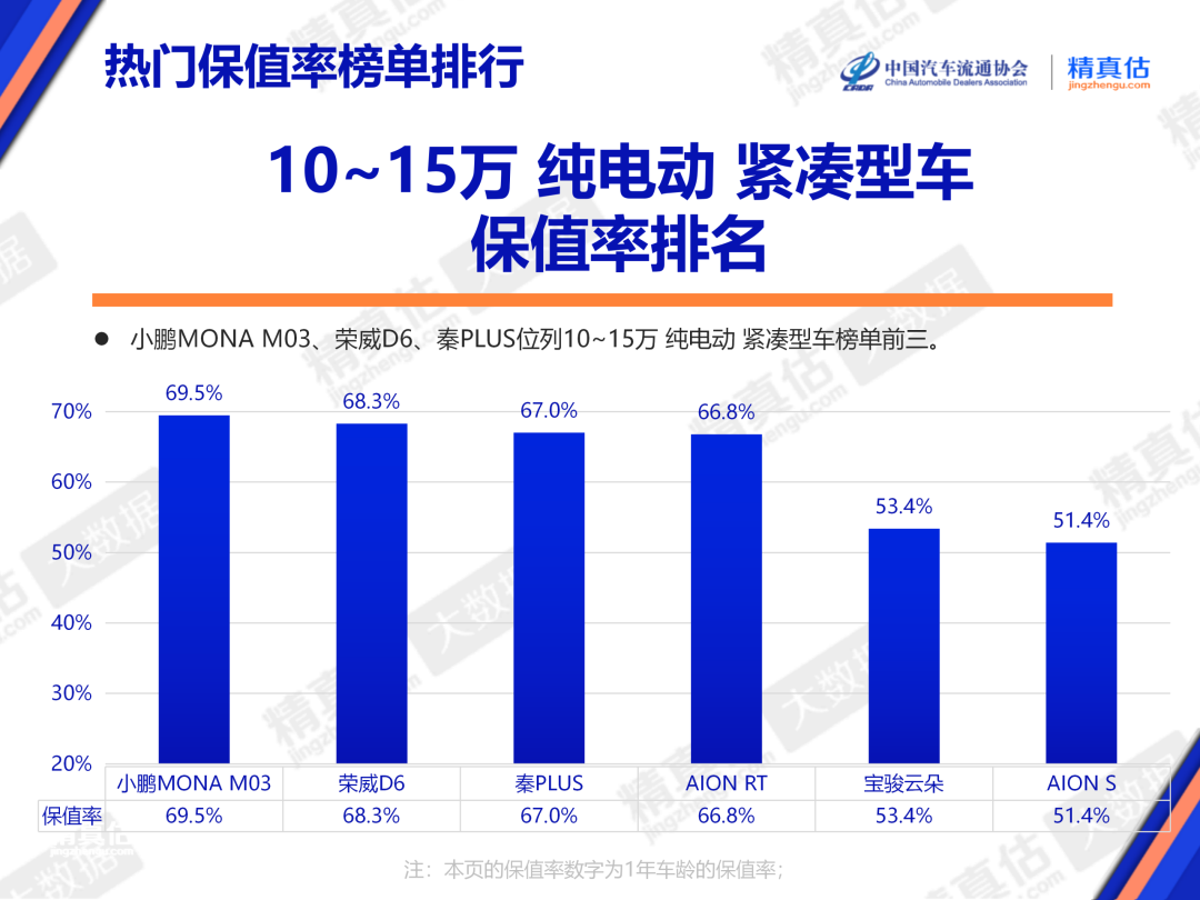 在10-15万纯电动紧凑型车这一竞争最为惨烈赛道,市场呈现出不同的趋势走势:智能化体验正在成为价值新锚点,而精准的性价比定位依然拥有强大的市场号召力。小鹏MONA M03以领先的智能座舱体验、扎实的智驾能力以及年轻化的设计语言,保值率排名第一;荣威D6凭借扎实的三电系统、宽敞实用的空间布局以及极具竞争力的定价,精准满足了务实型家庭用户的核心诉求,保值率排名第二;秦PLUS凭借庞大的市场保有量稳居保值率第三名。