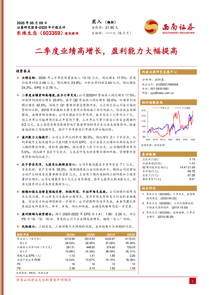 西南证券:东珠生态(603359)-二季度业绩高增长,盈利能力大幅提高.pdf
