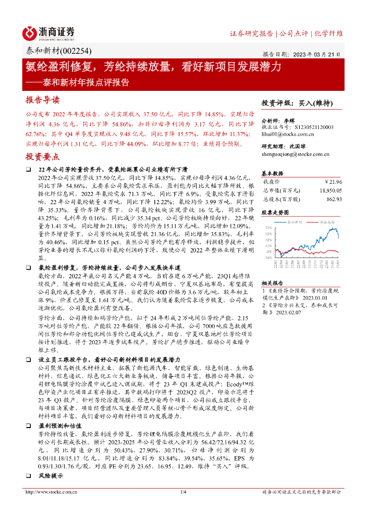 浙商证券:泰和新材年报点评报告:氨纶盈利修复,芳纶持续放量,看好新项目发展潜力.pdf