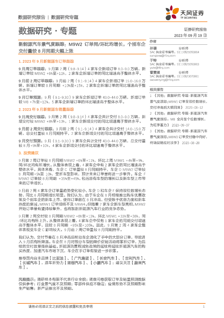 天风证券:新能源汽车景气度跟踪:M9W2订单同/环比均增长,个别车企交付量较8月同期大幅上涨.pdf