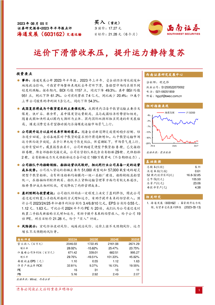 西南证券:海通发展(603162)-运价下滑营收承压,提升运力静待复苏.pdf