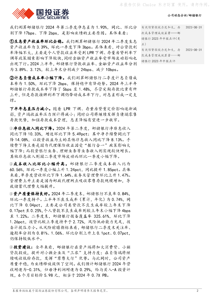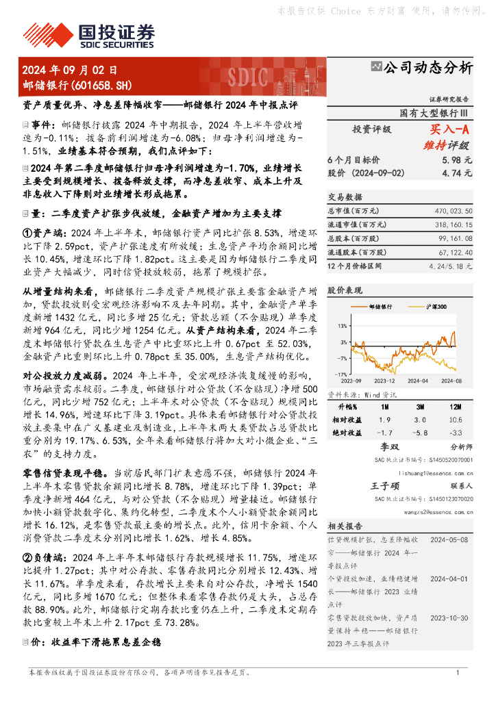 国投证券:邮储银行2024年中报点评:资产质量优异、净息差降幅收窄.pdf