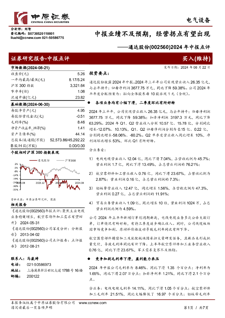 中原证券:通达股份(002560)-2024年中报点评:中报业绩不及预期,经营拐点有望出现.pdf