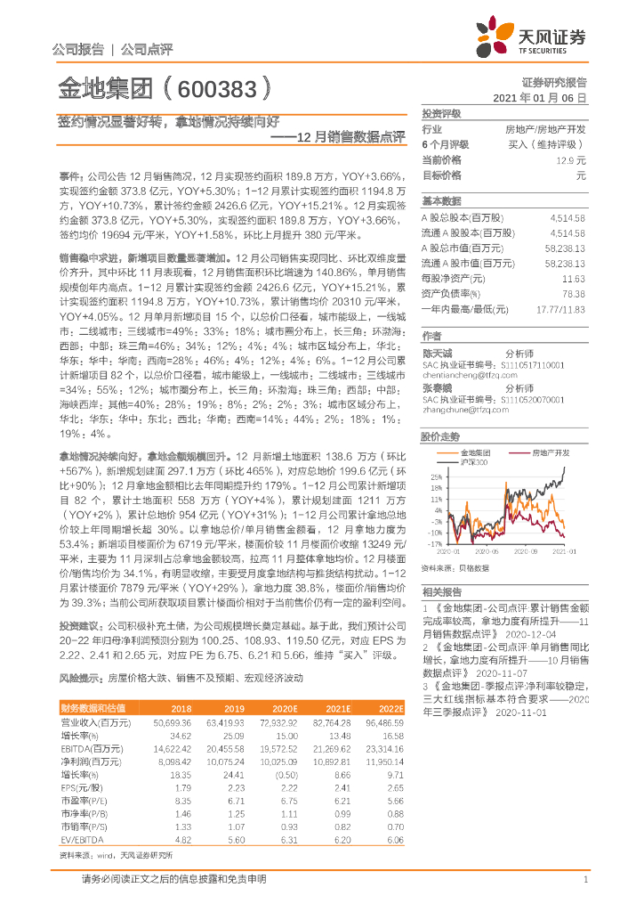 天风证券:金地集团(600383)-12月销售数据点评:签约情况显著好转,拿地情况持续向好.pdf