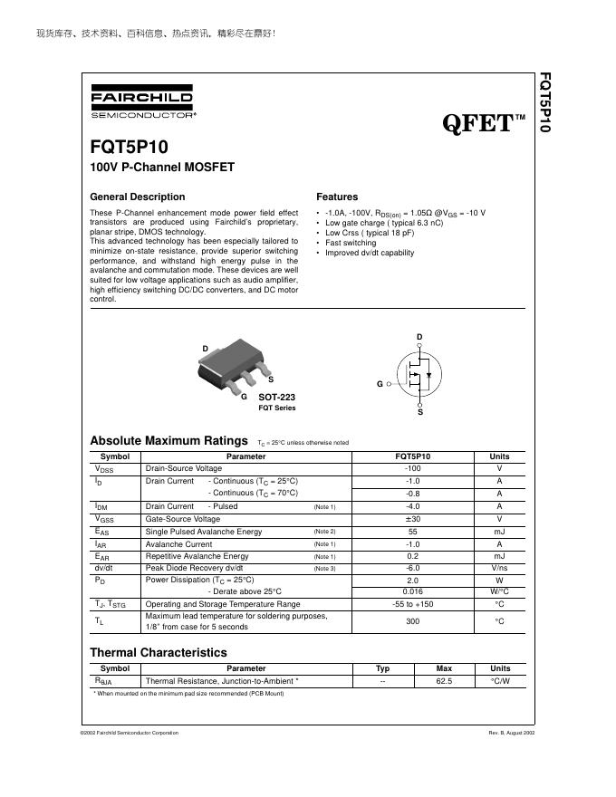 FAIRCHILD FQT5P10 100V P-Channel MOSFET 数据手册.pdf