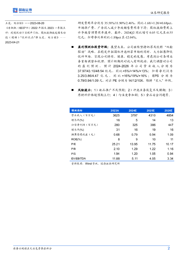 国海证券:香飘飘(603711)-2024年半年报点评:Q2收入承压,期待产品新定位下的后续发展.pdf