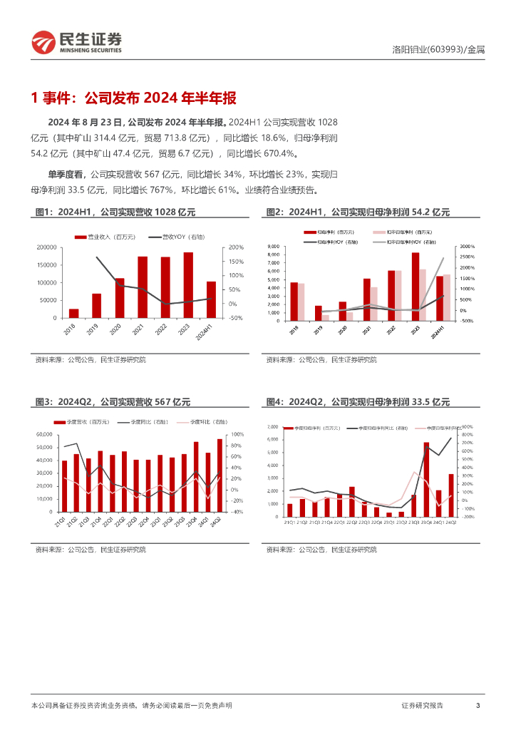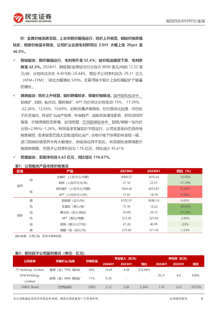 民生证券:洛阳钼业(603993)-2024年半年报深度点评:业绩历史最佳,“双子星”放光芒.pdf