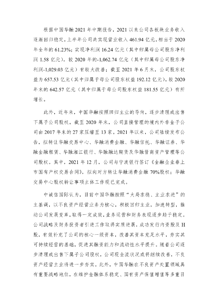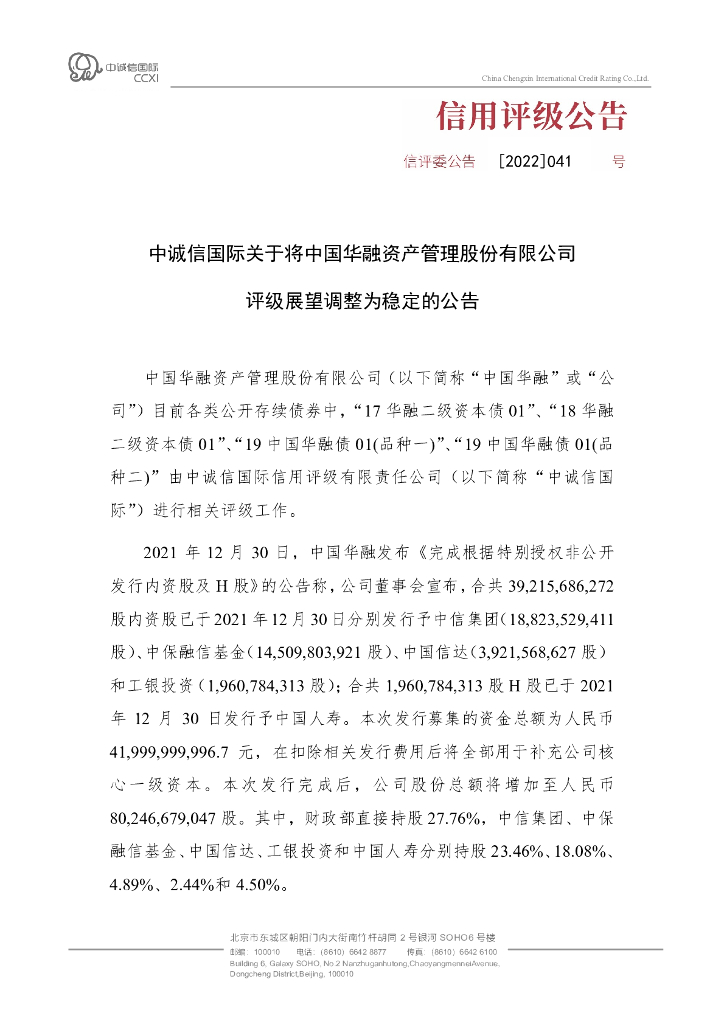 中诚信:中诚信国际关于将中国华融资产管理股份有限公司评级展望调整为稳定的公告.pdf