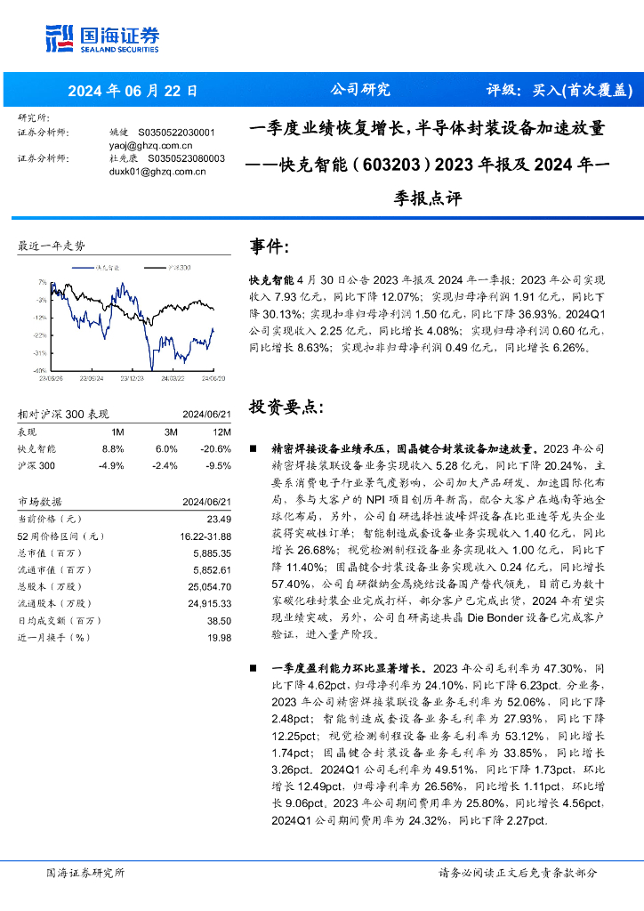 国海证券:快克智能(603203)-2023年报及2024年一季报点评:一季度业绩恢复增长,半导体封装设备加速放量.pdf