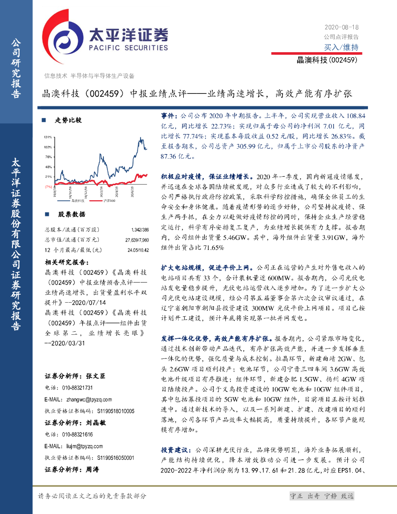 太平洋证券:晶澳科技(002459)-中报业绩点评:业绩高速增长,高效产能有序扩张.pdf