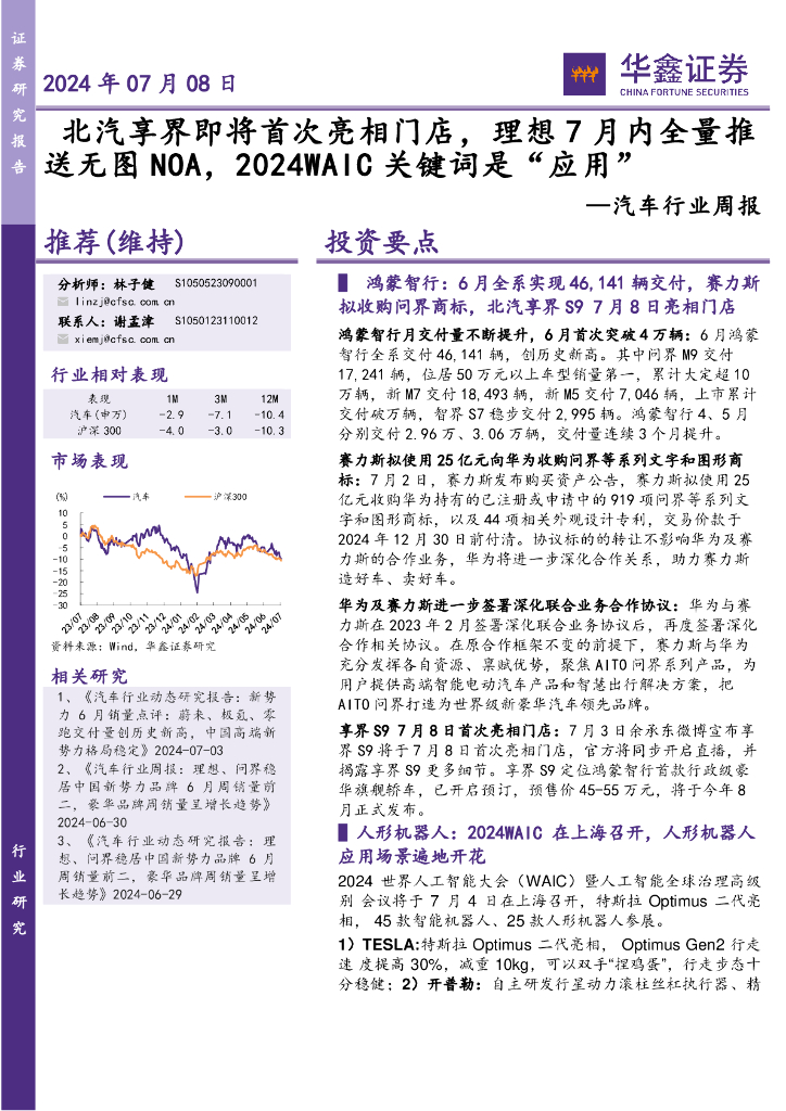 华鑫证券:汽车行业周报:北汽享界即将首次亮相门店,理想7月内全量推送无图NOA,2024WAIC关键词是“应用”.pdf