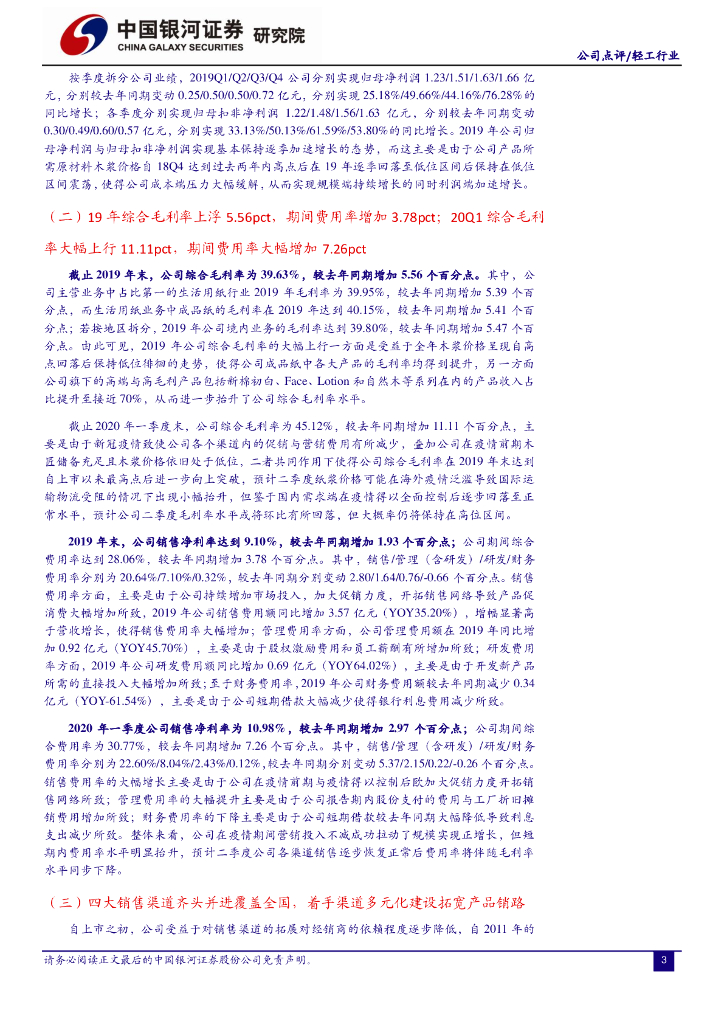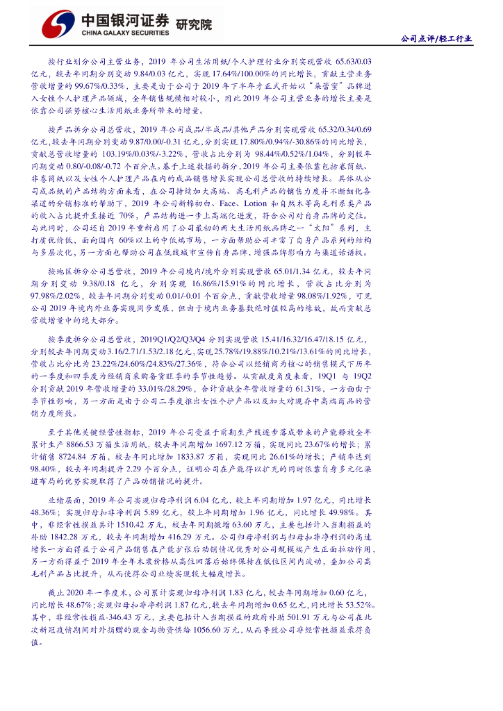 中国银河:中顺洁柔(002511)-19年原材料价格高位回落促成经营亮眼表现,20Q1逆势营销业绩持续高增长,予以推荐.pdf