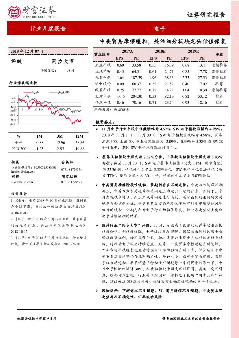 财富证券:电子行业月度报告:中美贸易摩擦缓和,关注细分板块龙头估值修复.pdf