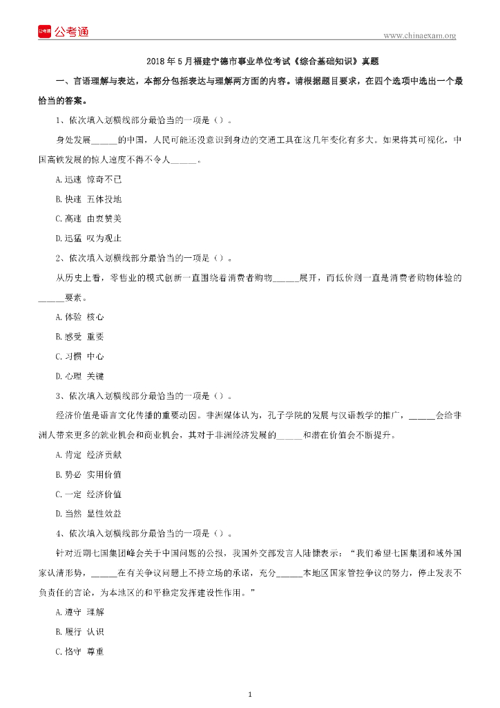 2018年5月福建宁德事业单位考试《综合基础知识》真题.pdf