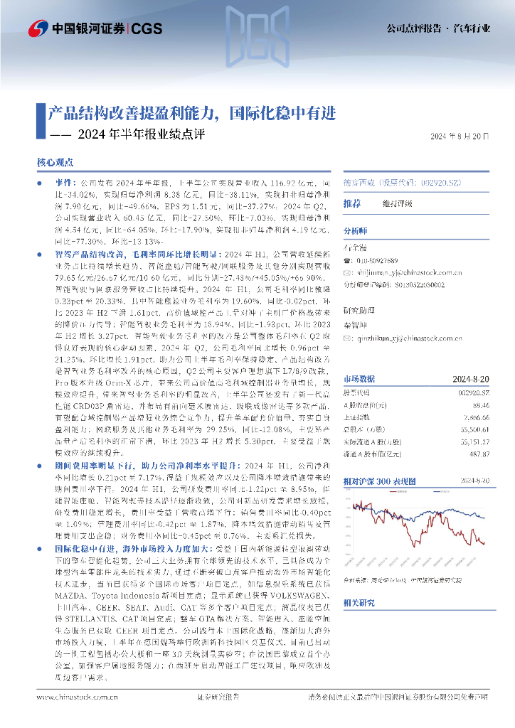 中国银河:德赛西威(002920)-2024年半年报业绩点评:产品结构改善提盈利能力,国际化稳中有进.pdf