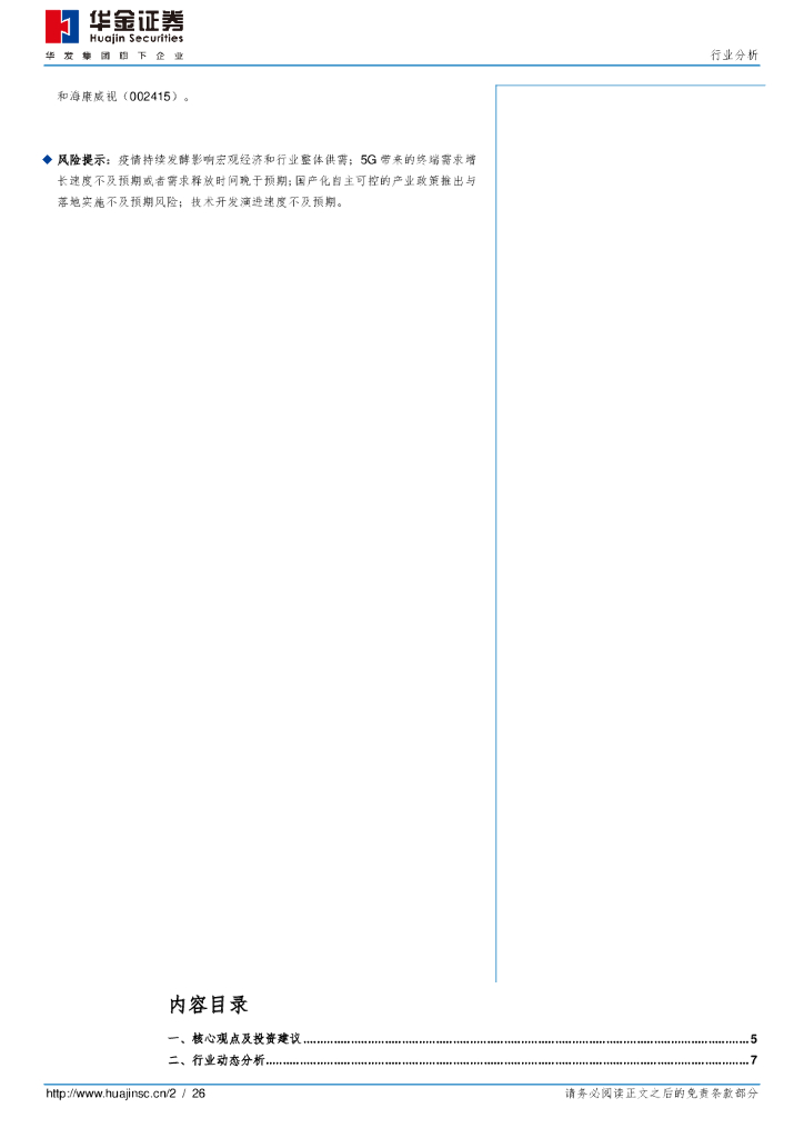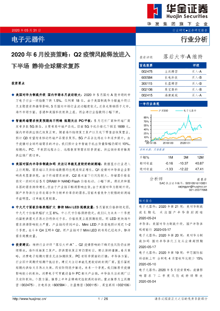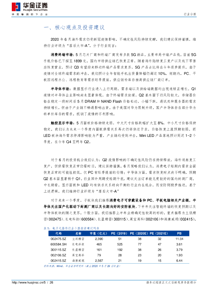 华金证券:电子元器件2020年6月投资策略:Q2疫情风险释放进入下半场静待全球需求复苏.pdf