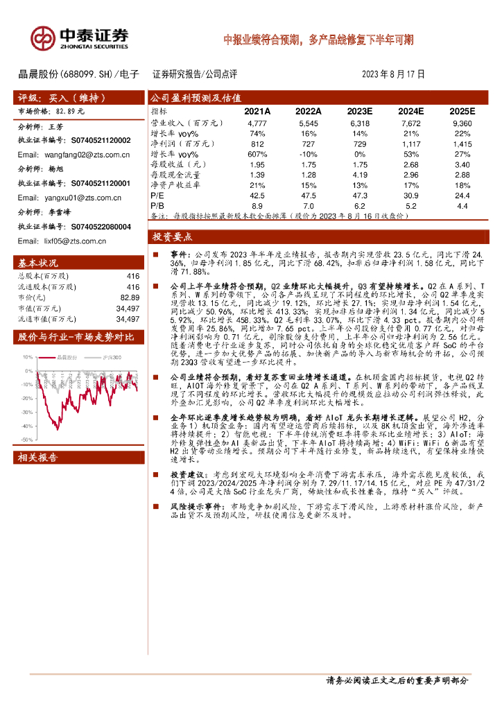 中泰证券:晶晨股份(688099)-中报业绩符合预期,多产品线修复下半年可期.pdf