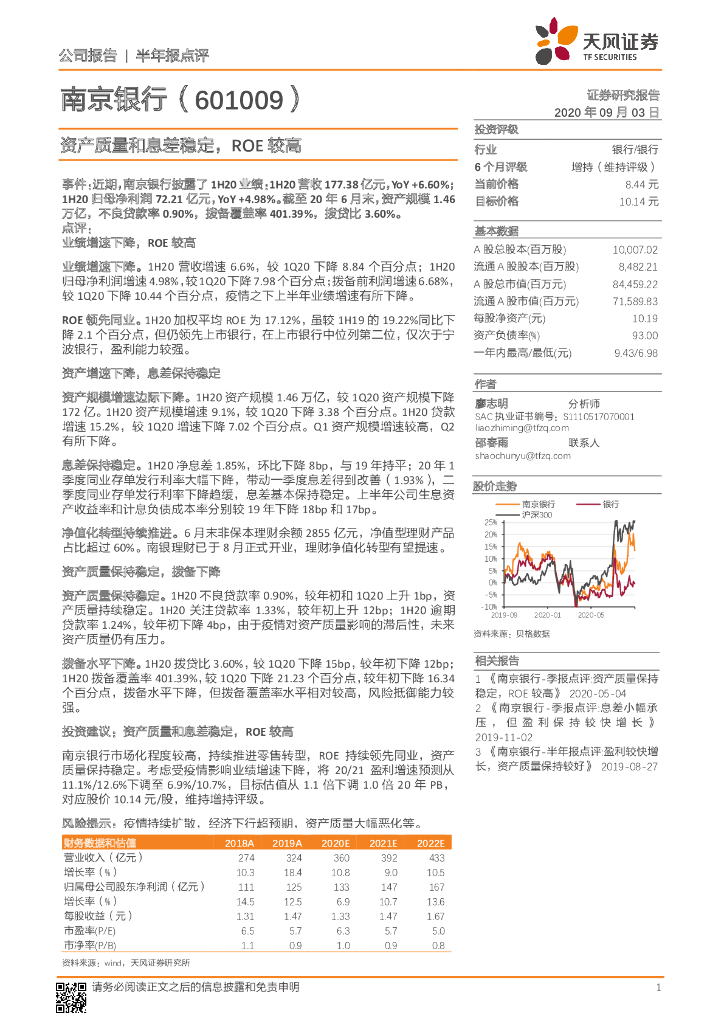 天风证券:南京银行(601009)-资产质量和息差稳定,ROE较高.pdf
