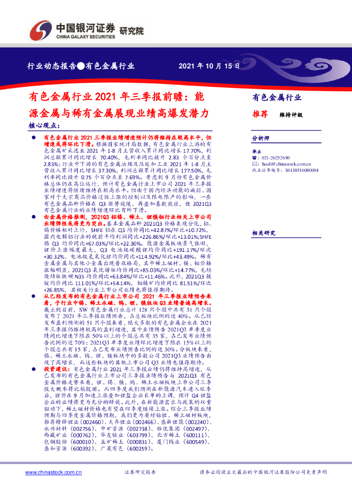 中国银河:有色金属行业2021年三季报前瞻:能源金属与稀有金属展现业绩高爆发潜力.pdf