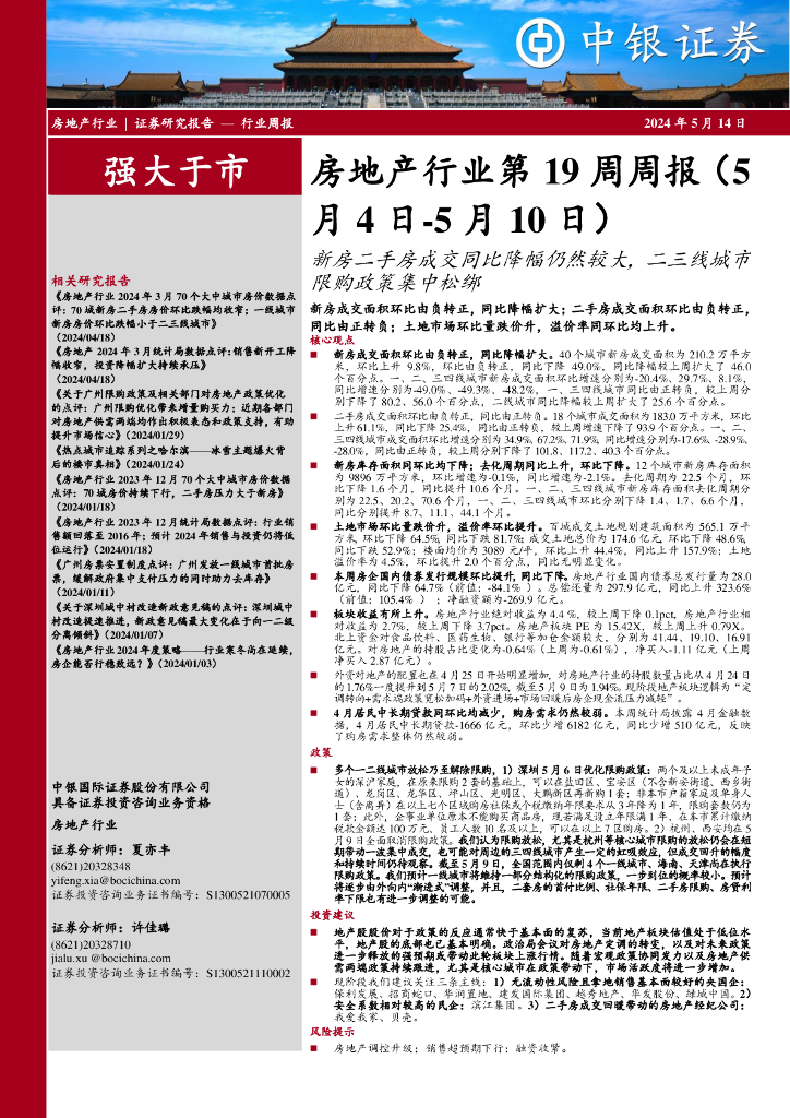 中银证券:房地产行业第19周周报(5:月4日-5月10日)新房二手房成交同比降幅仍然较大,二三线城市限购政策集中松绑.pdf