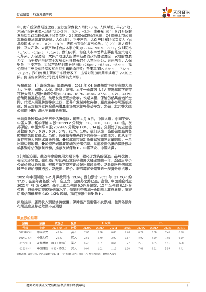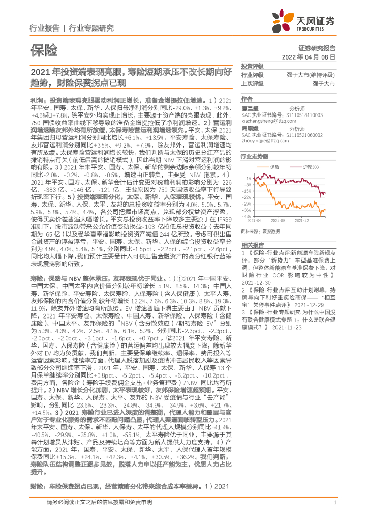 天风证券:保险:2021年投资端表现亮眼,寿险短期承压不改长期向好趋势,财险保费拐点已现.pdf