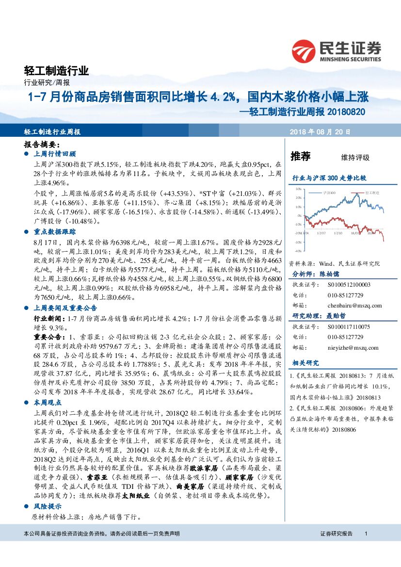 民生证券:轻工制造行业周报:1-7月份商品房销售面积同比增长4.2%,国内木浆价格小幅上涨.pdf