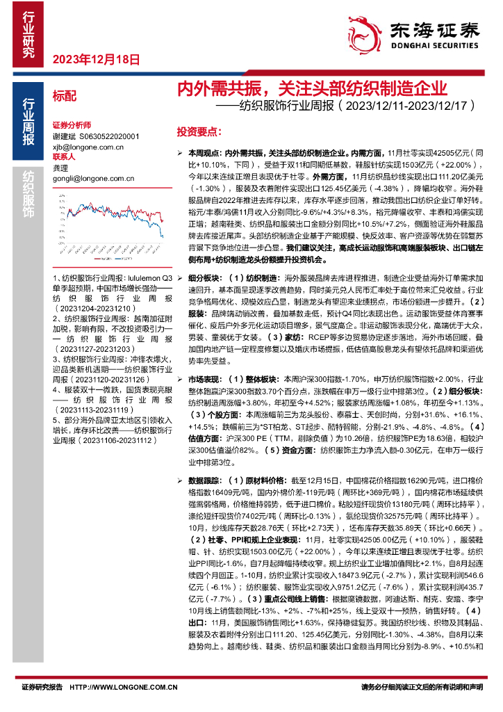 东海证券:纺织服饰行业周报:内外需共振,关注头部纺织制造企业.pdf