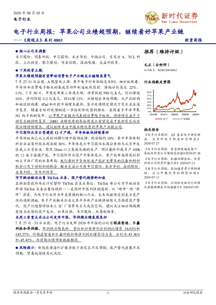 新时代证券:电子行业《周观点》系列:苹果公司业绩超预期,继续看好苹果产业链.pdf