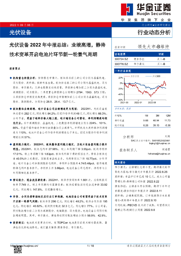 华金证券:光伏设备2022年中报总结:业绩高增,静待技术变革开启电池片环节新一轮景气周期.pdf