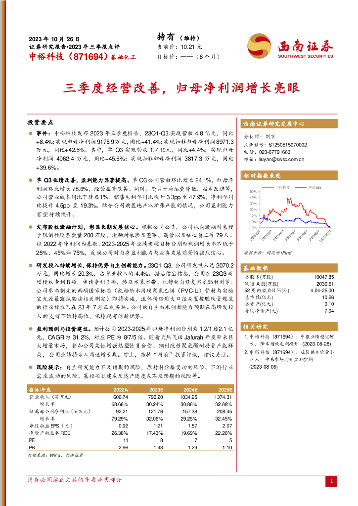 西南证券:中裕科技(871694)-2023年三季报点评:三季度经营改善,归母净利润增长亮眼.pdf