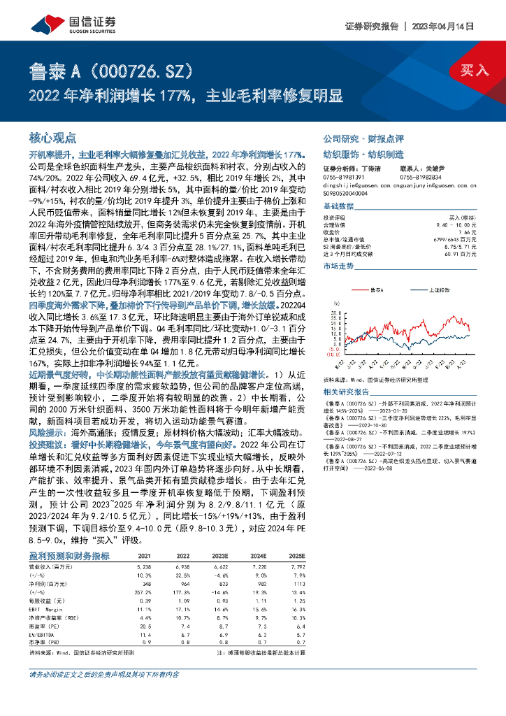 国信证券:鲁泰A(000726)-2022年净利润增长177%,主业毛利率修复明显.pdf
