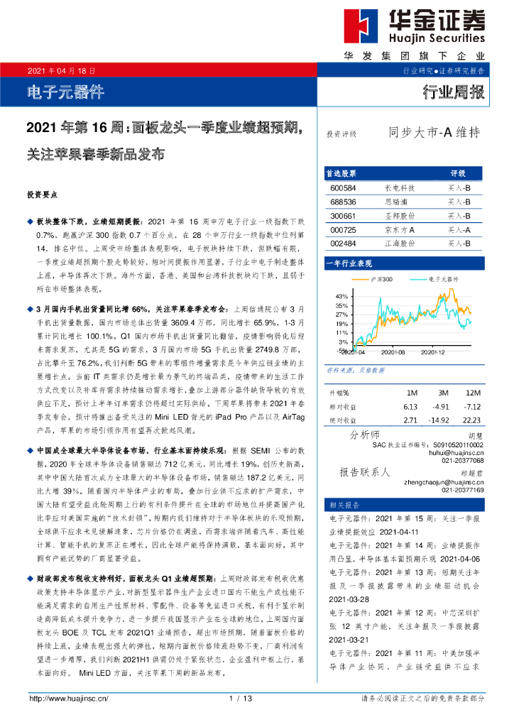 华金证券:电子元器件2021年第16周:面板龙头一季度业绩超预期,关注苹果春季新品发布.pdf