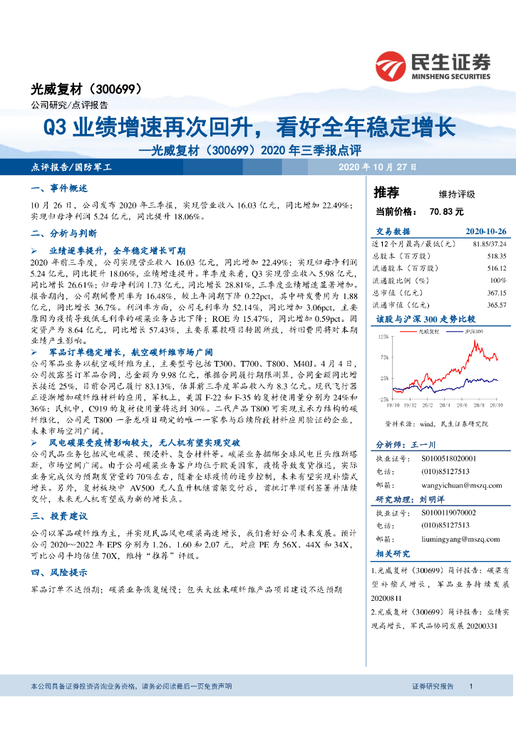 民生证券:光威复材(300699)-2020年三季报点评:Q3业绩增速再次回升,看好全年稳定增长.pdf