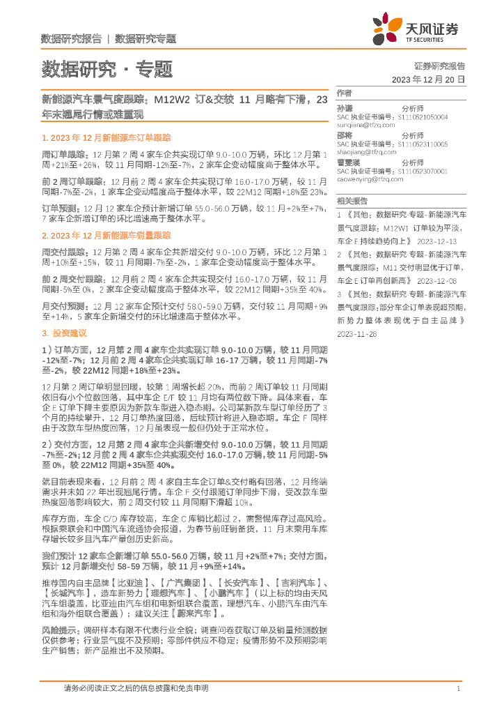 天风证券:新能源汽车景气度跟踪:M12W2订&交较11月略有下滑,23年末翘尾行情或难重现.pdf