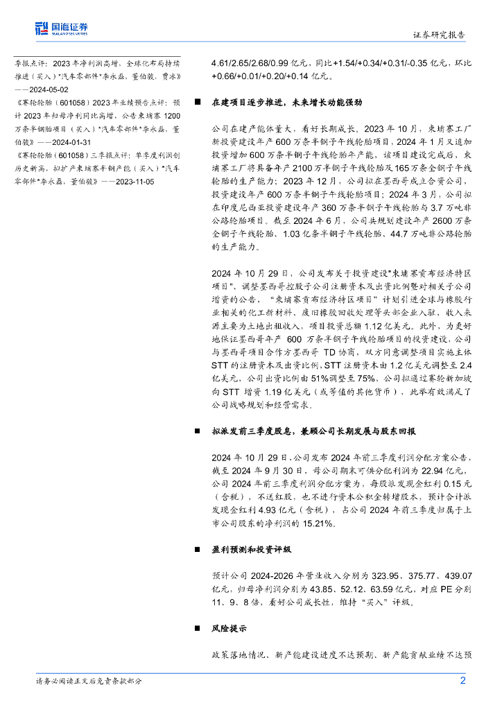 国海证券:赛轮轮胎(601058)-2024年三季报点评:三季度扣非归母净利润创历史新高,拟对墨西哥控股子公司增资.pdf