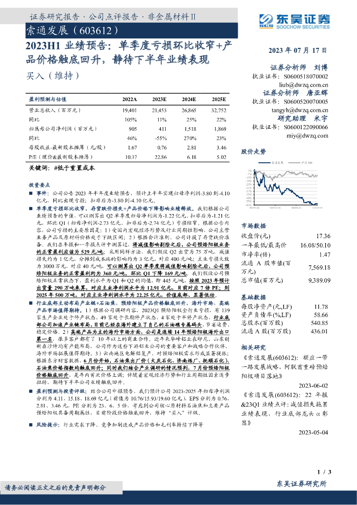 东吴证券:索通发展(603612)-2023H1业绩预告:单季度亏损环比收窄+产品价格触底回升,静待下半年业绩表现.pdf