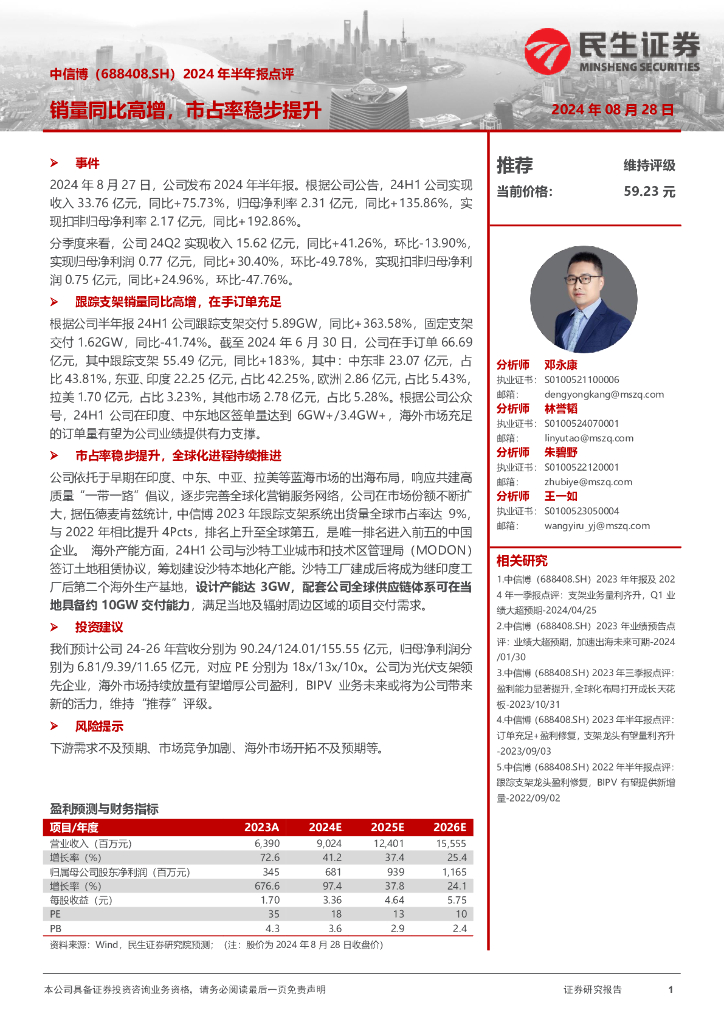 民生证券:中信博(688408)-2024年半年报点评:销量同比高增,市占率稳步提升.pdf