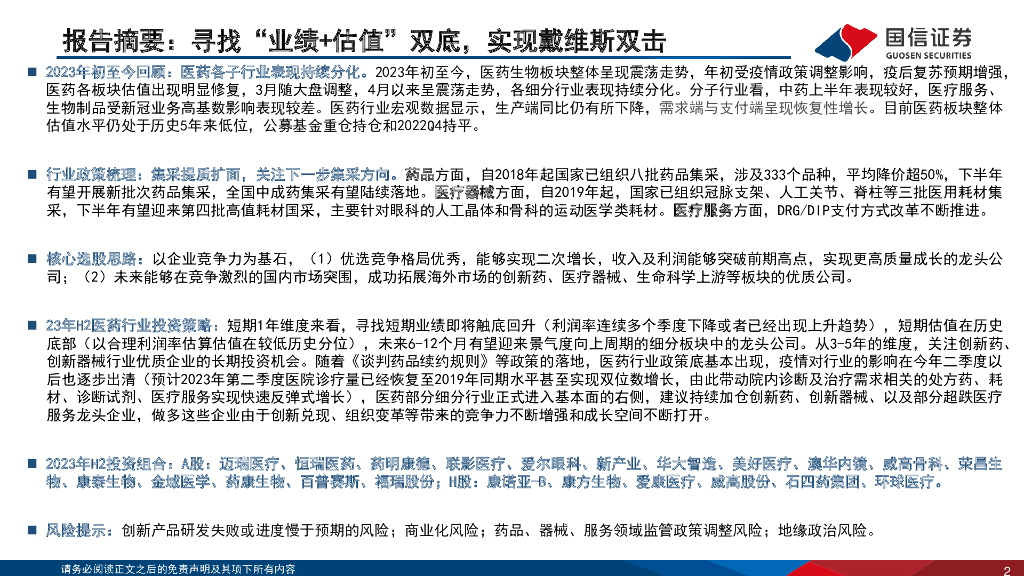 国信证券:医药生物行业2023下半年投资策略:寻找“业绩+估值”双底,实现戴维斯双击.pdf
