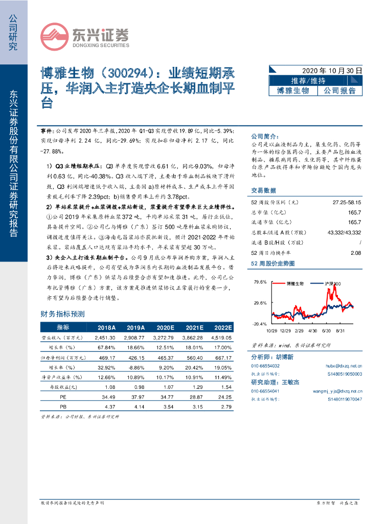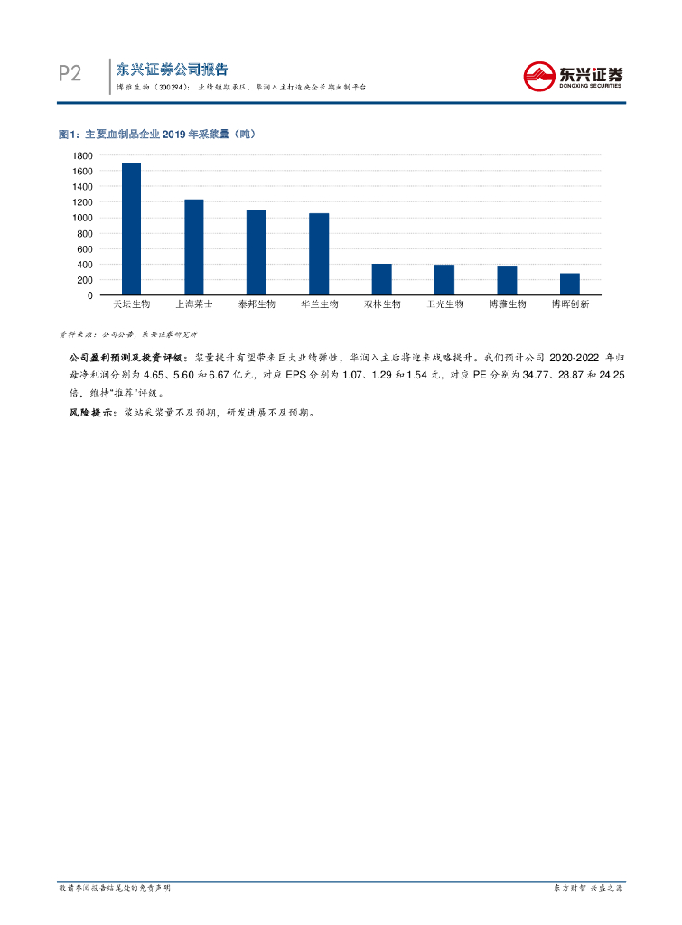 东兴证券:博雅生物(300294)-业绩短期承压,华润入主打造央企长期血制平台.pdf