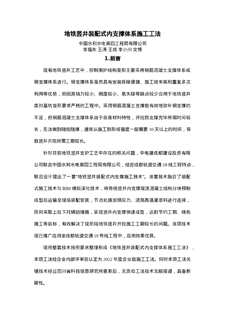 QHGF-2022126 地铁竖井装配式内支撑体系施工工法.doc