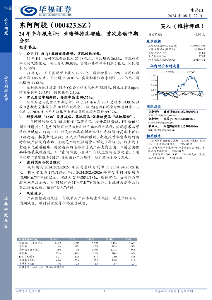 华福证券:东阿阿胶(000423)-24年半年报点评:业绩保持高增速,首次启动中期分红.pdf