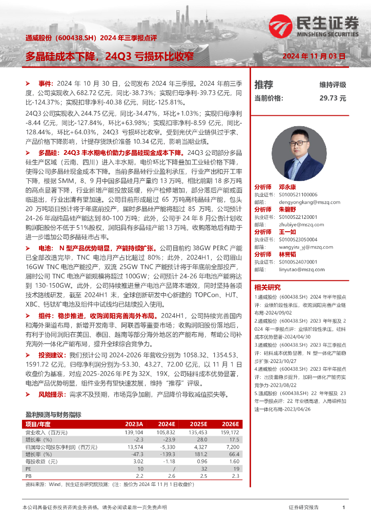 民生证券:通威股份(600438)-2024年三季报点评:多晶硅成本下降,24Q3亏损环比收窄.pdf