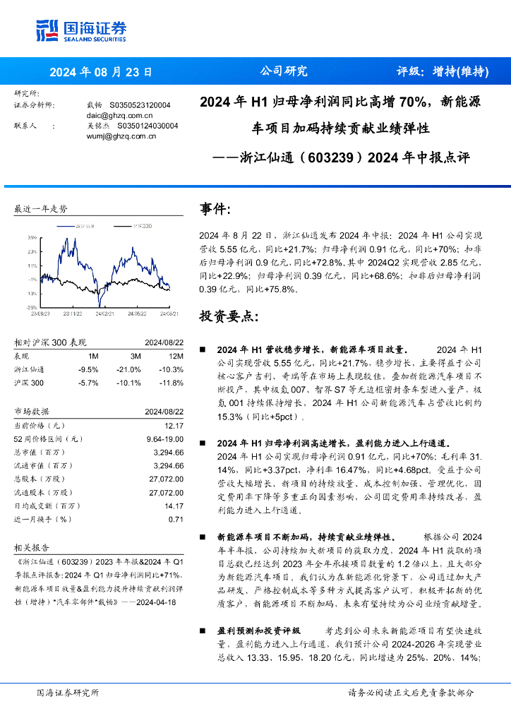 国海证券:浙江仙通(603239)-2024年中报点评:2024年H1归母净利润同比高增70%,新能源车项目加码持续贡献业绩弹性.pdf