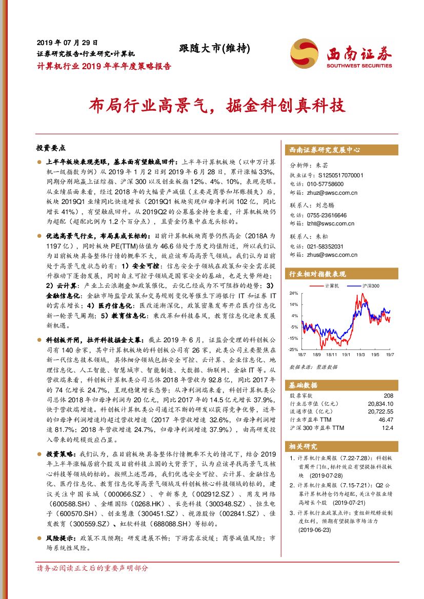 西南证券:计算机行业2019年半年度策略报告:布局行业高景气,掘金科创真科技.pdf
