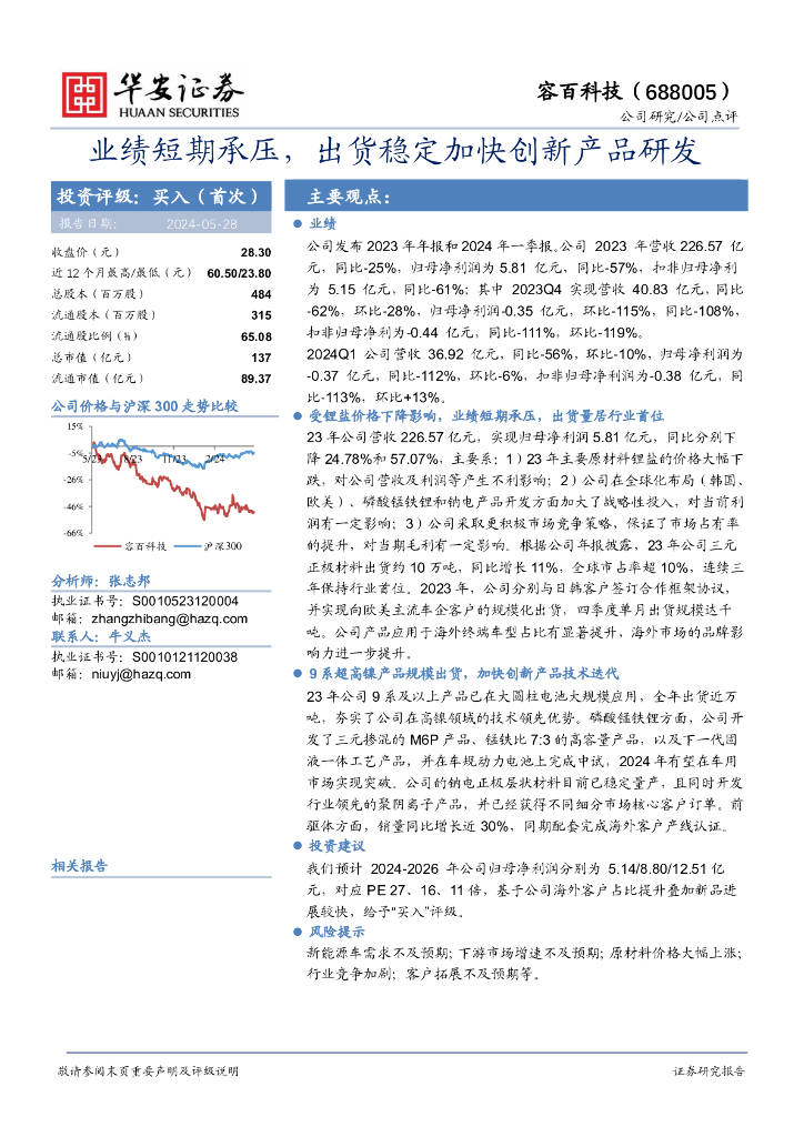 华安证券:容百科技(688005)-业绩短期承压,出货稳定加快创新产品研发.pdf