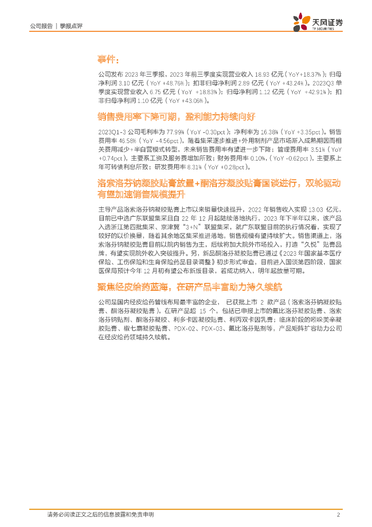 天风证券:九典制药(300705)-盈利能力向好,看好凝胶贴膏大单品持久续航.pdf