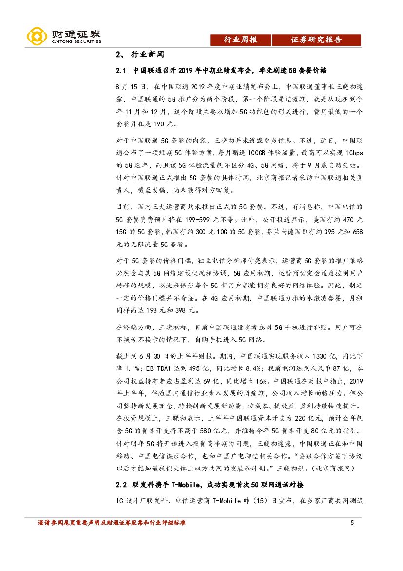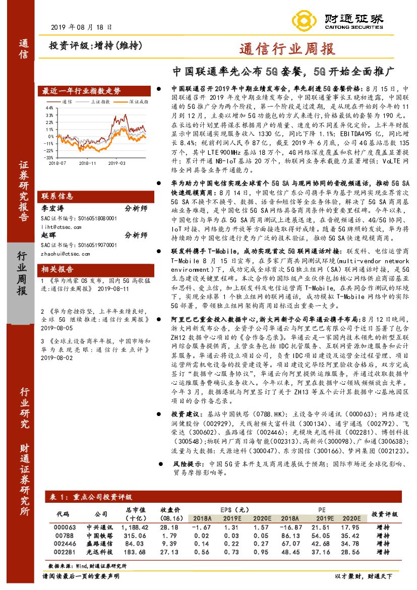 财通证券:通信行业周报:中国联通率先公布5G套餐,5G开始全面推广.pdf
