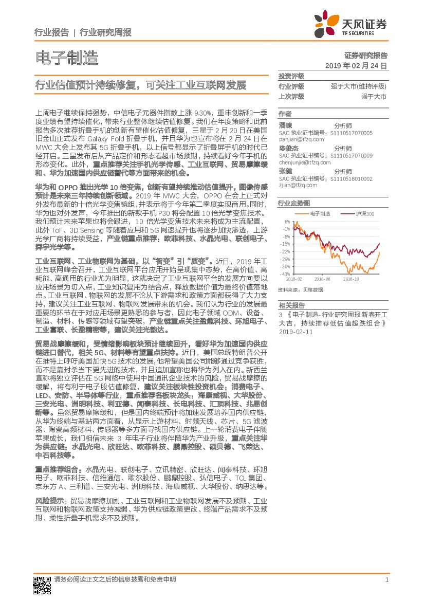天风证券:电子制造行业研究周报:行业估值预计持续修复,可关注工业互联网发展.pdf